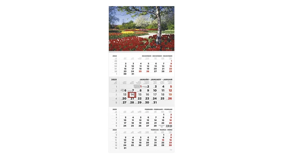 1 tömbből álló 4 havi speditőr falinaptár. A naptár teljes mérete: 315x693 mm. Reklámfelület: 315x480 mm.
