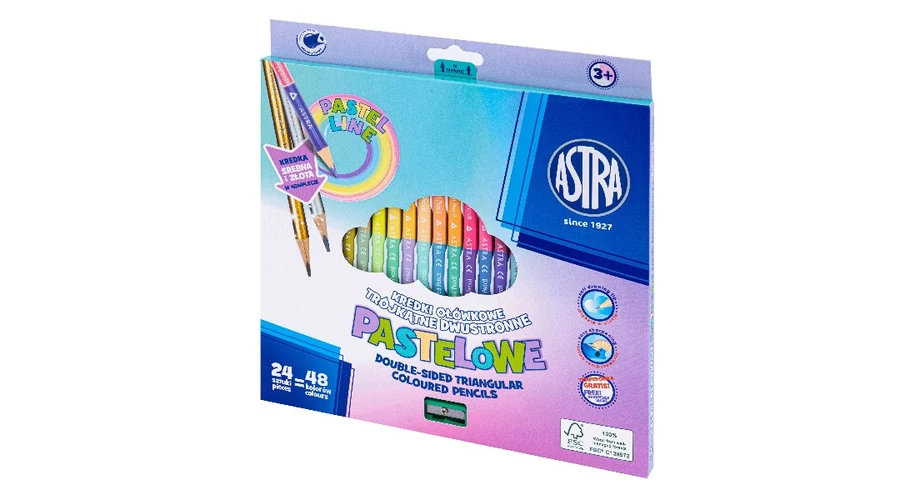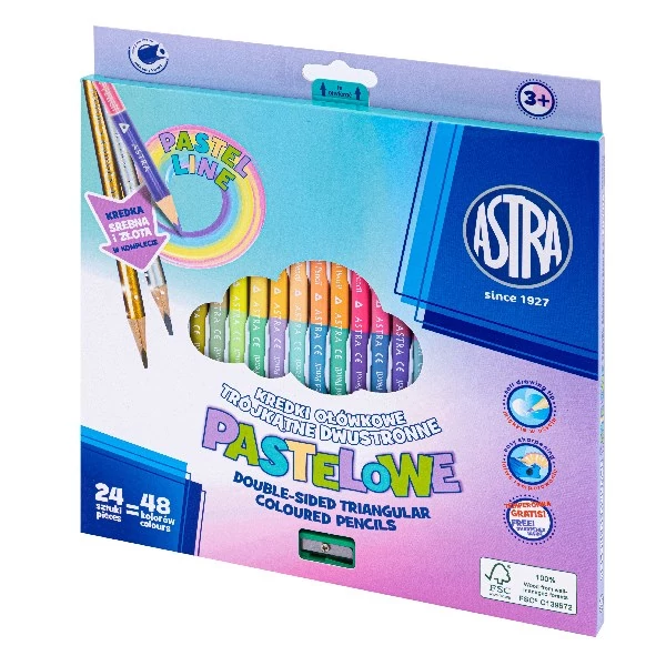 Színes ceruza ASTRA pasztell háromszögletű duó kétvégű + arany/ezüst 24 darabos 48 színű