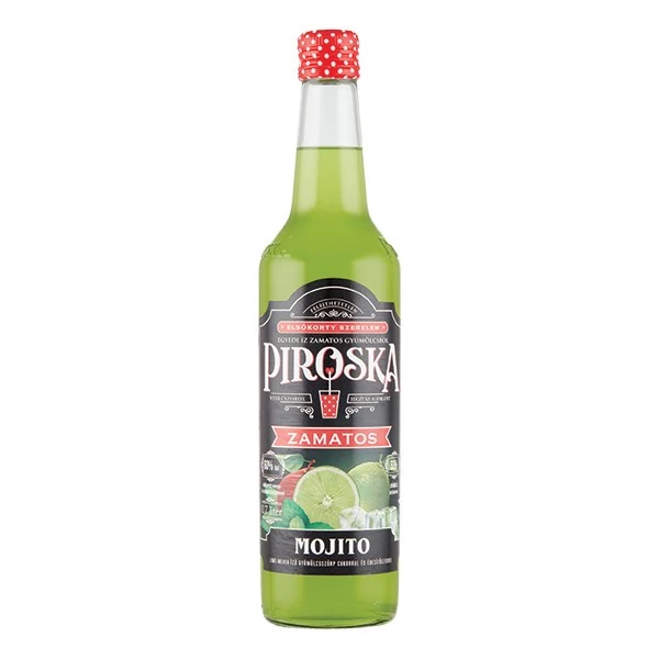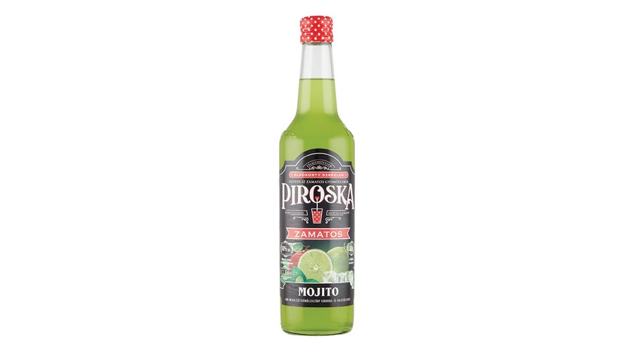Piroska Mojito lime-menta ízű gyümölcsszörp cukorral és édesítőszerrel, 33% gyümölcstartalommal, 60%-kal csökkentett energia-és szénhidráttartalommal.