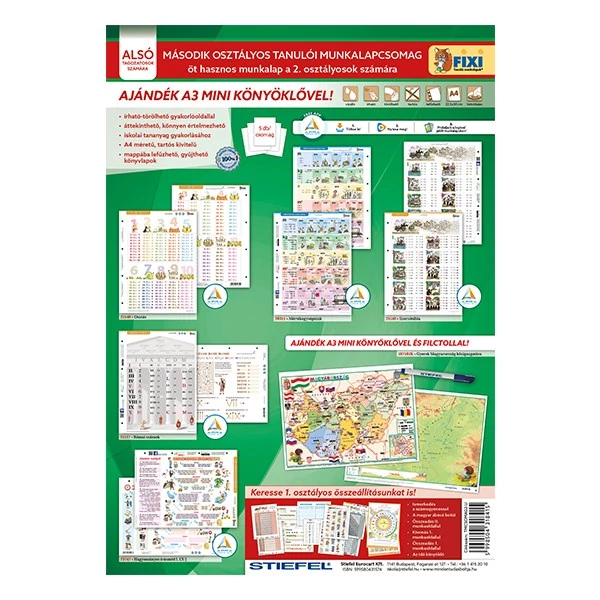 5 db tanulói lap 1 db gyerek Mo. alátéttel és kék filctollal. A Fixi tanulói munkalapok a magyar oktatásban széleskörűen használt falitérképek és oktatótablók kicsinyített másai, nemcsak az órai munkát, hanem az otthoni gyakorlást is megkönnyítik. Minden munkalap írható-letörölhető, cseppálló fóliabevonattal készül, a lyukasztás pedig megkönnyíti a gyűjtését és tárolását a lapoknak. A legkisebbeknek készült az új kétoldalas Magyarország térkép, mely csak az alsó tagozatosok számára szükséges információkat tartalmazza. A Magyarország közigazgatását ábrázoló térkép a megyék és a fontos nagyvárosok feltüntetése mellett, a jellegzetes épületek rajzaival megismerésre ösztönzi a gyermekeket vagy emlékezteti őket a családi kirándulásokon látott szépségekre. Az alátét hátoldalán Magyarország domborzati térképe látható.
