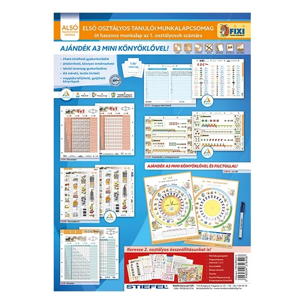 5 db tanulói lap 1 db Idő alátéttel és kék filctollal. A Fixi tanulói munkalapok a magyar oktatásban széleskörűen használt falitérképek és oktatótablók kicsinyített másai, nemcsak az órai munkát, hanem az otthoni gyakorlást is megkönnyítik. A kemény fóliával bevont alátétek azon kívül, hogy esztétikusak, egy sor további elonnyel bírnak: védi az asztalt a karcolástól, vízállóak. Az Idő A3 alátéten az idővel kapcsolatos minden fogalom érthetően, egyetlen tablón összefoglalva. Szemléletes rajzai és játékosságai könnyebbé teszik a gyermekek számára az időfogalmak elsajátítását.