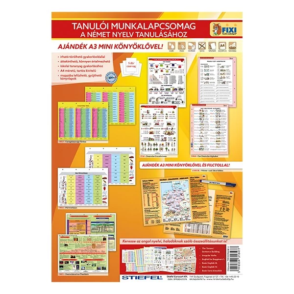 5 db tanulói lap 1 db Angol abc alátéttel és kék filctollal. A Fixi tanulói munkalapok a magyar oktatásban széleskörűen használt falitérképek és oktatótablók kicsinyített másai, nemcsak az órai munkát, hanem az otthoni gyakorlást is megkönnyítik. Minden munkalap írható-letörölhető, cseppálló fóliabevonattal készül, a lyukasztás pedig megkönnyíti a gyűjtését és tárolását a lapoknak. Az A3 méretű alátéten az Angol abc, hátoldalán Nagy-Britannia térképe található.
