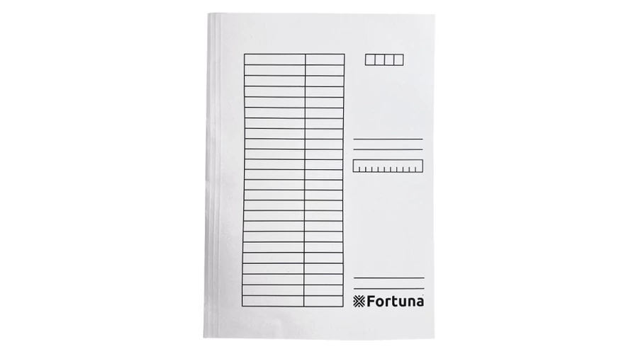 Belül natúr, kívül fehér színű, 230 gr-os kartonból készült három pólyás Fortuna iratgyűjtő mappa, elején feliratozásra alkalmas nyomattal. A mappában elhelyezett lapok a behajtott pólyák segítségével akadályozzák meg a benne tárolt lapok széthullását. Kisebb mennyiségű irat tárolására alkalmas.