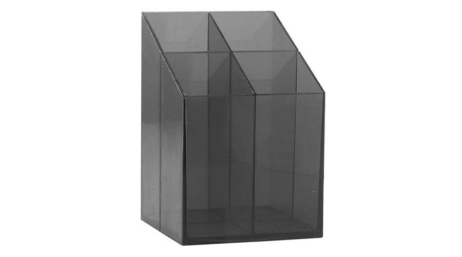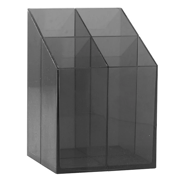 Asztali írószertartó szögletes kivitelben, 4 tárolórekesszel. Választható színek: szürke, transzparens kék, transzparens fekete. Feltöltés nélkül!
