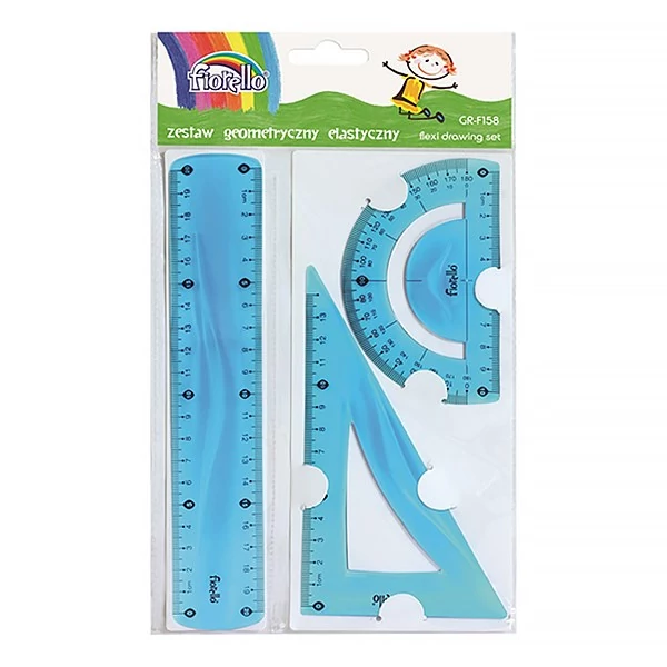 Törhetetlen, rugalmas műanyagból készült, színes, hajlékony vonalzókészlet. Tartalma: 20 cm egyenes vonalzó, 14 cm-es 90 fokos vonalzó, szögmérő.