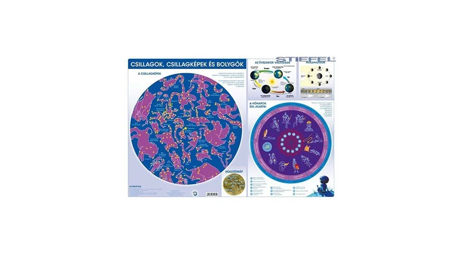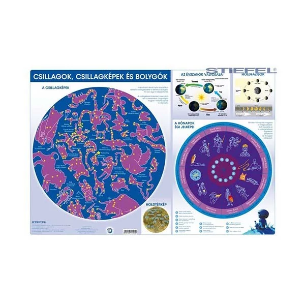 Környezetünk fokozatos megismerése már egészen kicsi kortól foglalkoztat minket. Minél inkább tágul látóterünk, annál inkább használunk térképeket is. A tabló szemléletesen mutatja be a Magyarországról látható csillagképeket, és megismertet a bolygónkkal összefüggő legfontosabb jelenségekkel. A címoldalon a csillagképek grafikus ábrázolásamegkönnyíti azok felismerését. Ezen kívül egy sor hasznos, a Föld forgásával és keringésével összefüggő információt is találhatunk itt: könnyen megérthető a rajzos ábrázolásból,miért változnak az évszakok illetve a Hold fázisai. Egyedülálló módon egy olyan naptár is felkerült a tablóra, amely a hónapok régi magyar nevét tartalmazza. A másik oldalon az északi féltekéről látható égbolt csillagképei mellett a Naprendszer bolygónak fontosabb adatait is megtalálhatjuk. Minden, a csillagászat iránt érdeklődő felnőtt és gyerek számára hasznos, és megkönnyíti az iskolai tananyag elsajátítását is.
