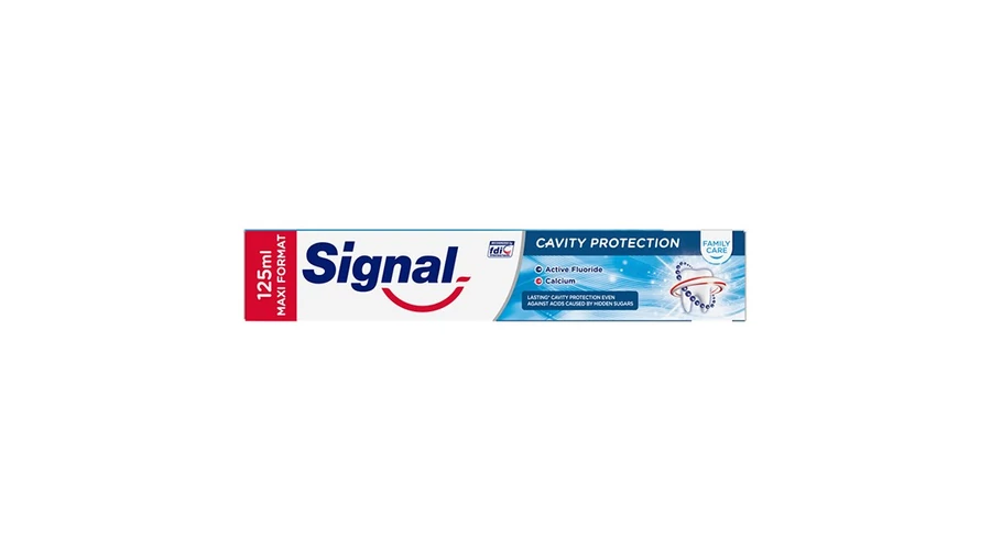A Signal Family Care Cavity Protection fogkrém tartós* fogszuvasodás elleni védelmet biztosít a család számára. Még az olyan ételek és italok is, mint a gabonapehely, a gyümölcsök és a joghurtok (melyekről nem is gondolnánk), magas cukortartalmúak lehetnek és fogszuvasodást okozhatnak. Az aktív fluoridot és kálciumot tartalmazó hatékony formula hosszan a fogmosás után is segít helyreállítani az apró, láthatatlan lyukakat a fogzománcon, melyeket a rejtett cukrokból képződő savak is okozhatnak. Hatékonyan segít erősíteni a fogzománcot a nap mint nap erős fogakért.