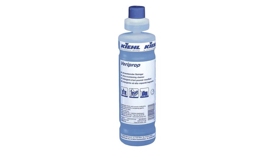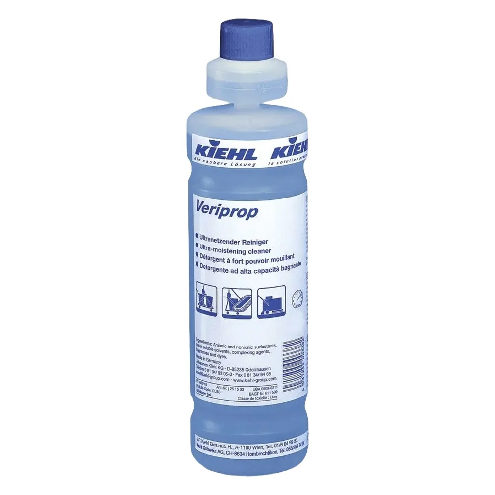 Kiehl Veriprop speciális tisztítószer koncentrátum magas aktivitású karbantartó tisztítószer. Teríthető tulajdonsága kiváló, ami által az erősen víztaszító padlófelületekről is maradéktalanul eltávolítja a szennyeződéseket. Csíkmentesen száradó tisztítószer. Elsősorban az erősen víztaszító, rugalmas padlók és finomszemcsés burkolatok tisztítására alkalmas. Használható más vízálló burkolaton is, mint a PVC, gumi vagy a linóleum, valamint bevonattal védett felületeken is.