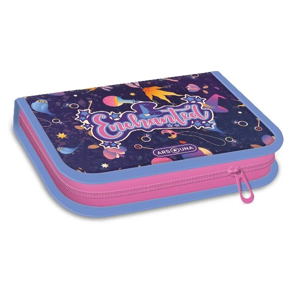 Írószerekkel töltött cipzáros tolltartó két kihajtható füllel, gumis kialakítással az írószerek tárolásához. Tartalma: 12 db színes ceruza, 3 db HB grafit ceruza, 1 vékony és 1 vastag postairón, 8 db színes filctoll, 1 db radír, 1 db hegyező, 1 db 17 cm-es egyenes vonalzó, 1 db háromszög vonalzó, órarend A és B hétre.