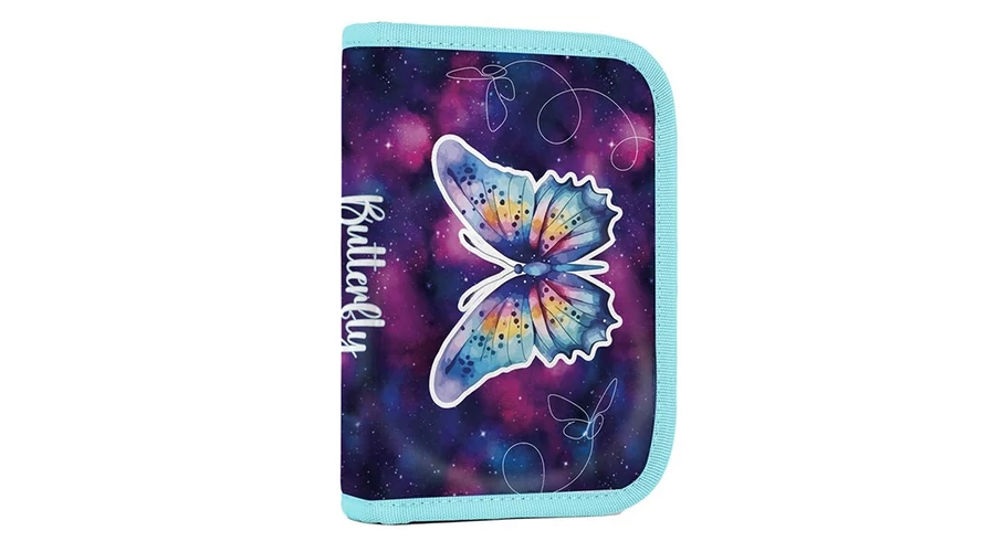 Egyszintes iskolai tolltartó 2 kihajtható füllel, üres. 25 gumipántot tartalmaz az írószerek rögzítéséhez. A belső füleken átlátszó fólia található az órarend számára.