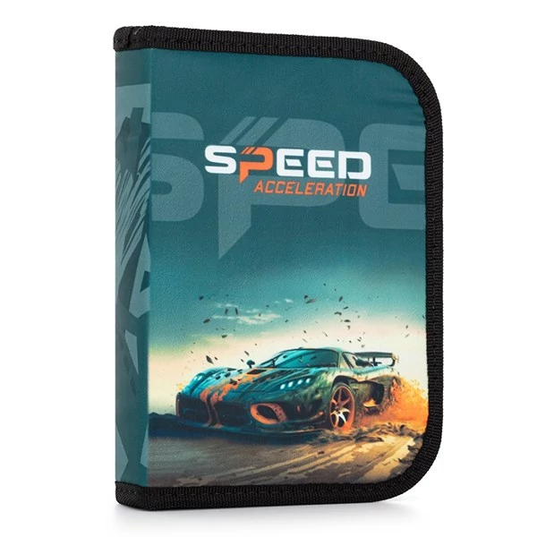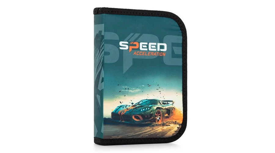 Egyszintes iskolai tolltartó 2 kihajtható füllel, üres. 25 gumipántot tartalmaz az írószerek rögzítéséhez. A belső füleken átlátszó fólia található az órarend számára.