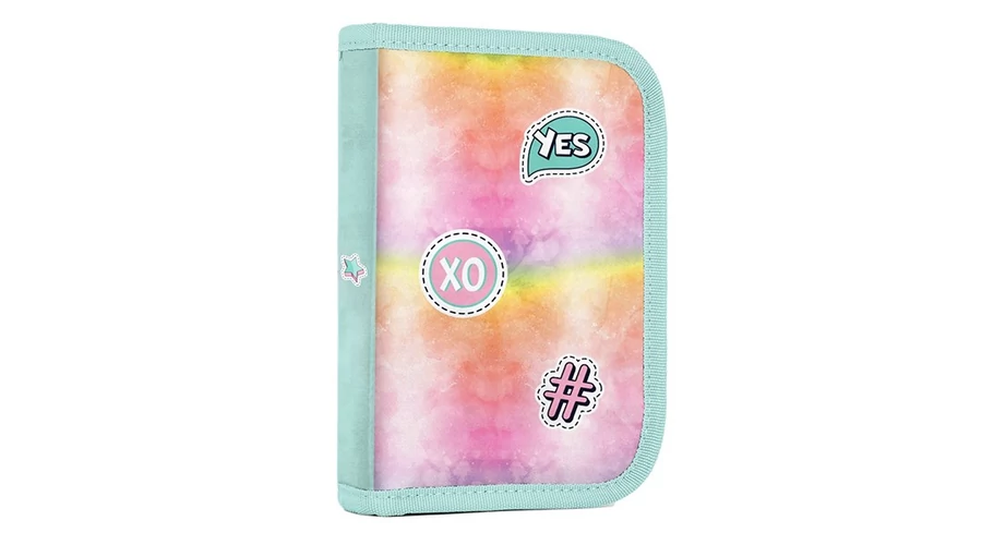 Egyszintes iskolai tolltartó 2 kihajtható füllel, üres. 25 gumipántot tartalmaz az írószerek rögzítéséhez. A belső füleken átlátszó fólia található az órarend számára.