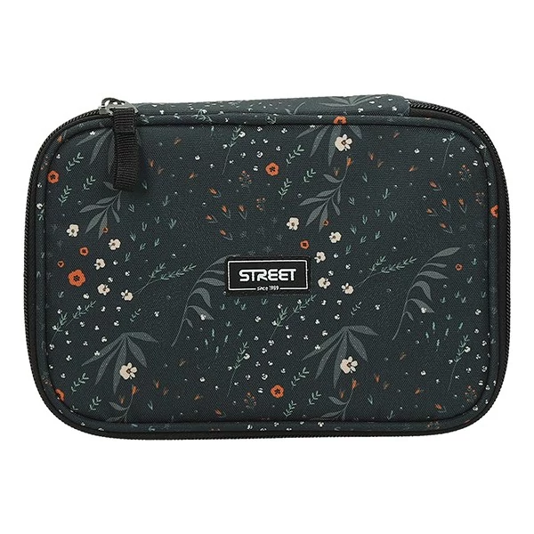 Belül textillel bevont merev lapokkal, gumis kialakítással az írószerek tárolásához, és egy cipzáras belső zsebbel.
