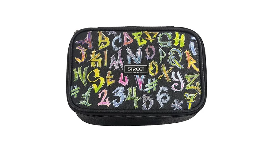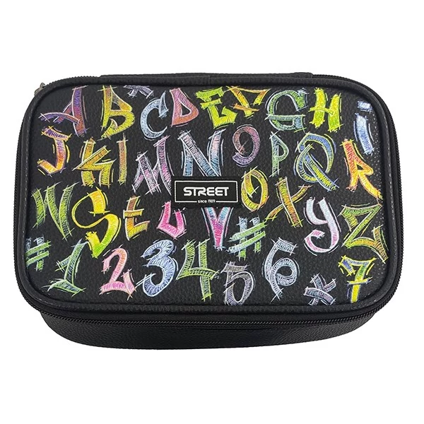 Belül textillel bevont merev lapokkal, gumis kialakítással az írószerek tárolásához, és egy cipzáras belső zsebbel.