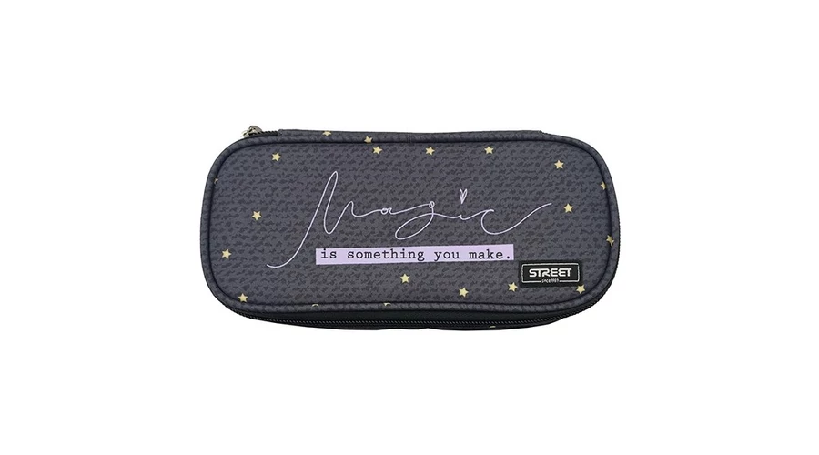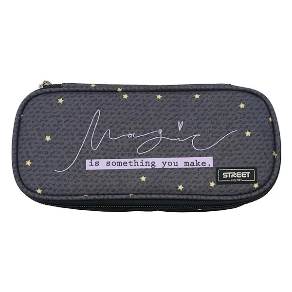 Többszintes, töltetlen, cipzáras tolltartó. Belül textillel bevont merev lapokkal, gumis kialakítással az írószerek tárolásához és egy cipzáras belső zsebbel.
