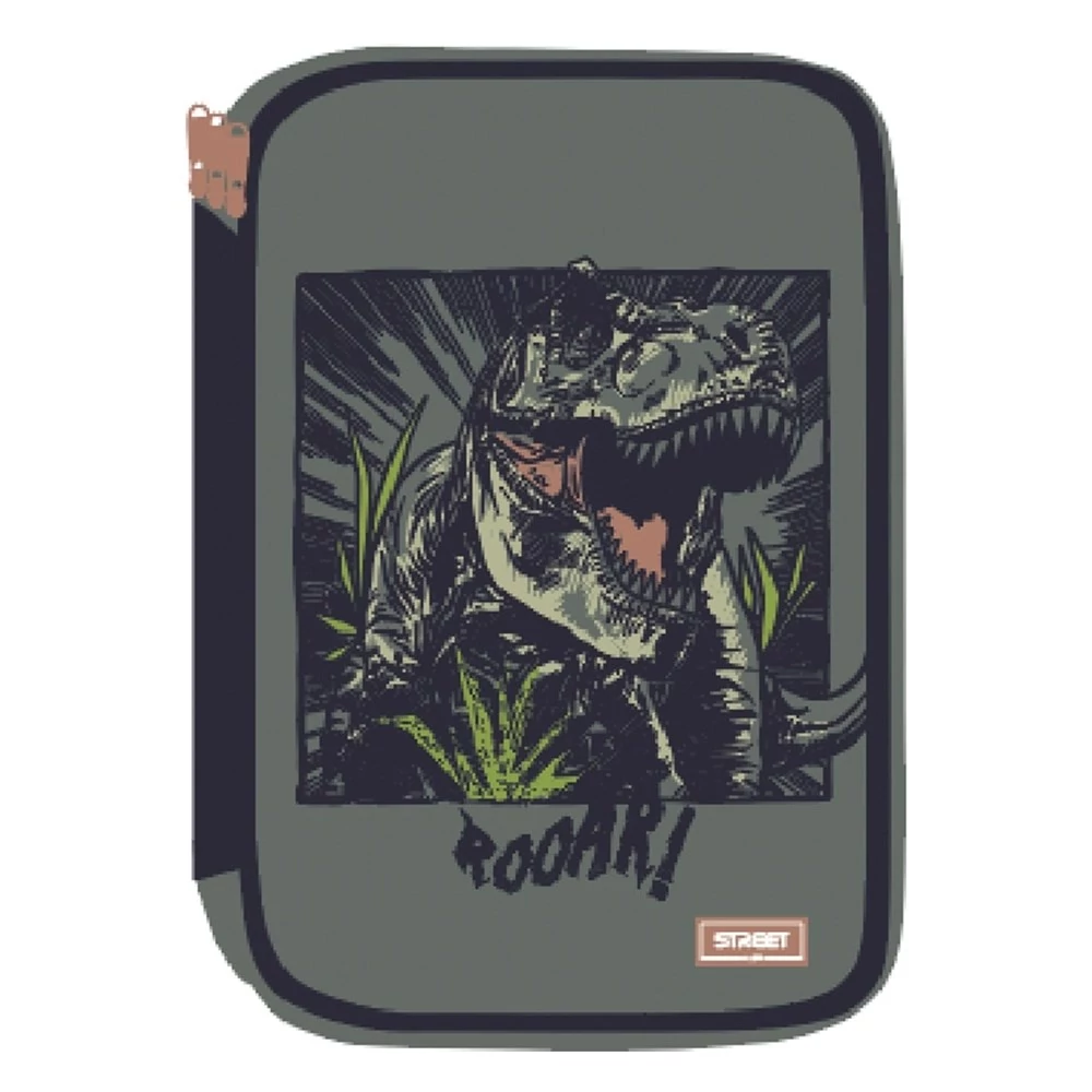 Többszintes írószerekkel töltött, cipzáras tolltartó.