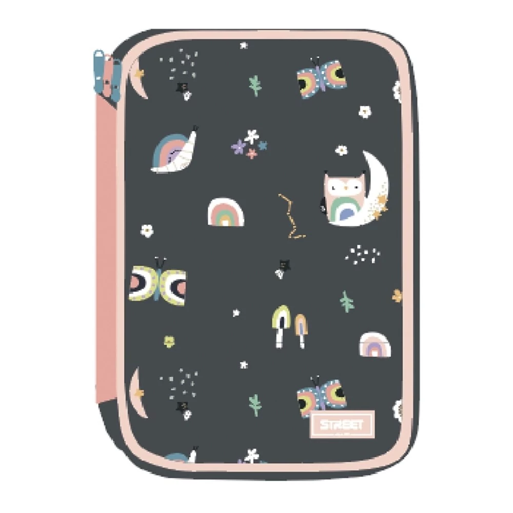 Többszintes írószerekkel töltött, cipzáras tolltartó.