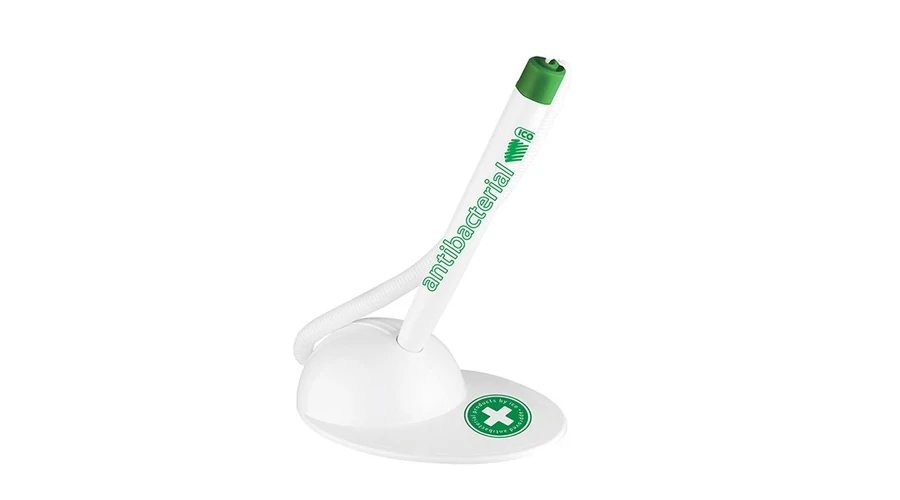 Antibakteriális ügyféltoll. A talprészén elhelyezett ragasztófelület segítségével, vízszintesen rögzíthető ügyféltoll. Cserélhető X-20 -as golyósbetéttel szerelve. Kék írásszín. Vonalvastagsága: 0,8 mm. Íráshossza: 2500 m.