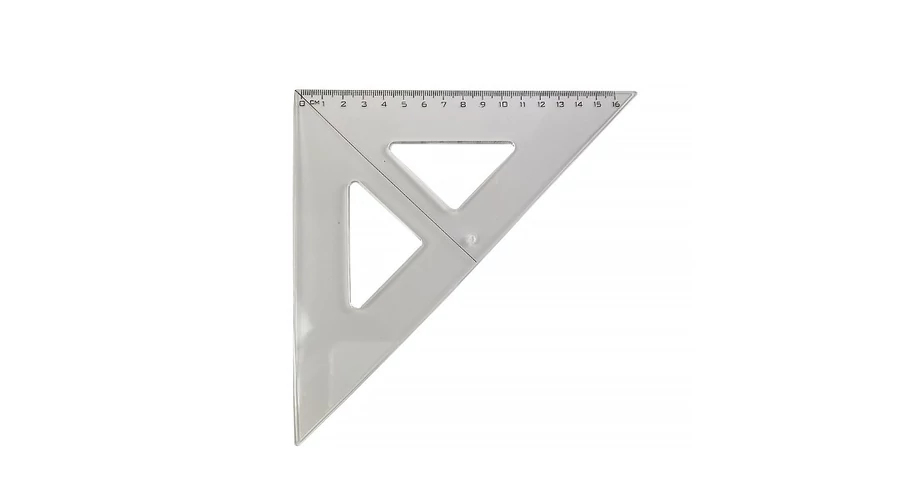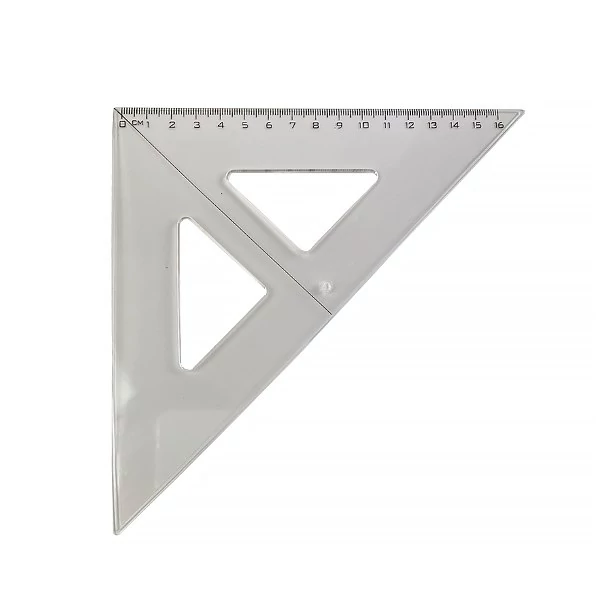 Átlátszó, műanyag, háromszög vonalzó 45 fokos 16 cm élű.
