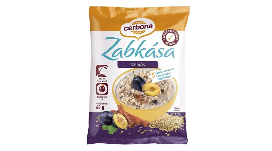 Cerbona szilvás-fahéjjas zabkása. Az instant Cerbona zabkása magas rosttartalommal teljes értékű zabpehellyel ideális reggeli vagy gyors ebéd azok számára, akik tudatosan odafigyelnek az egészségükre. A zab magas rosttartalma jótékony hatással van az emésztésre, illetve energiával tölti fel szervezetet. Elkészítése rendkívül egyszerű forró víz hozzáadásával pillanatok alatt fogyasztható.